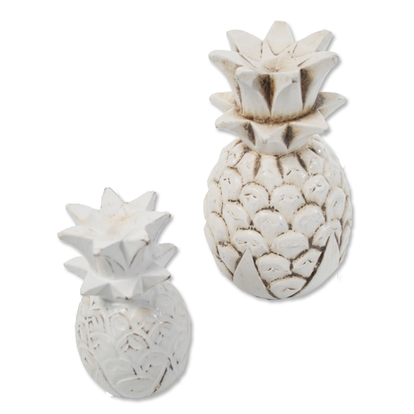 These lovely, hand-carved pineapples are made of Albacia, a fast growing and sustainable garden wood. Made in a traditional family workshop in Bali, they have an old style shabby chic look with a white wash finish. A bunch arranged in a big bowl creates a really striking centerpiece.