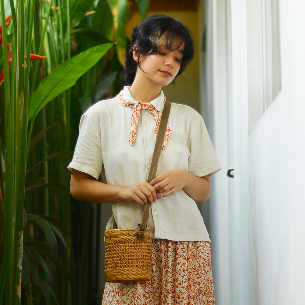 Tas anyaman rumit ini dibuat di desa pegunungan Bali Timur, di tengah hutan yang disebut Atta. Tas ini diasapi di atas sabut kelapa dan api madu untuk menghasilkan warna keemasan yang indah dan sedikit bau berasap. Dibuat oleh pengrajin yang sangat terampil, tas ini akan bertahan selama bertahun-tahun. Tas model bucket baru kami dirancang oleh Luciana Phillips, memiliki tali yang dapat disesuaikan panjangnya, dan tersedia dalam dua ukuran. Tas ini dilapisi dengan motif Balizen dan memiliki penutup tali serut.